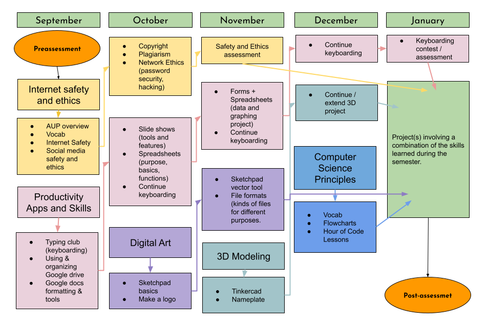 LaVenture's semester tech class for sixth grade consists of five units of instruction. All of the resources assume a class of students using district issued Chromebooks. Other resources (like a 3D printer) will be made available as needed. The five units are: